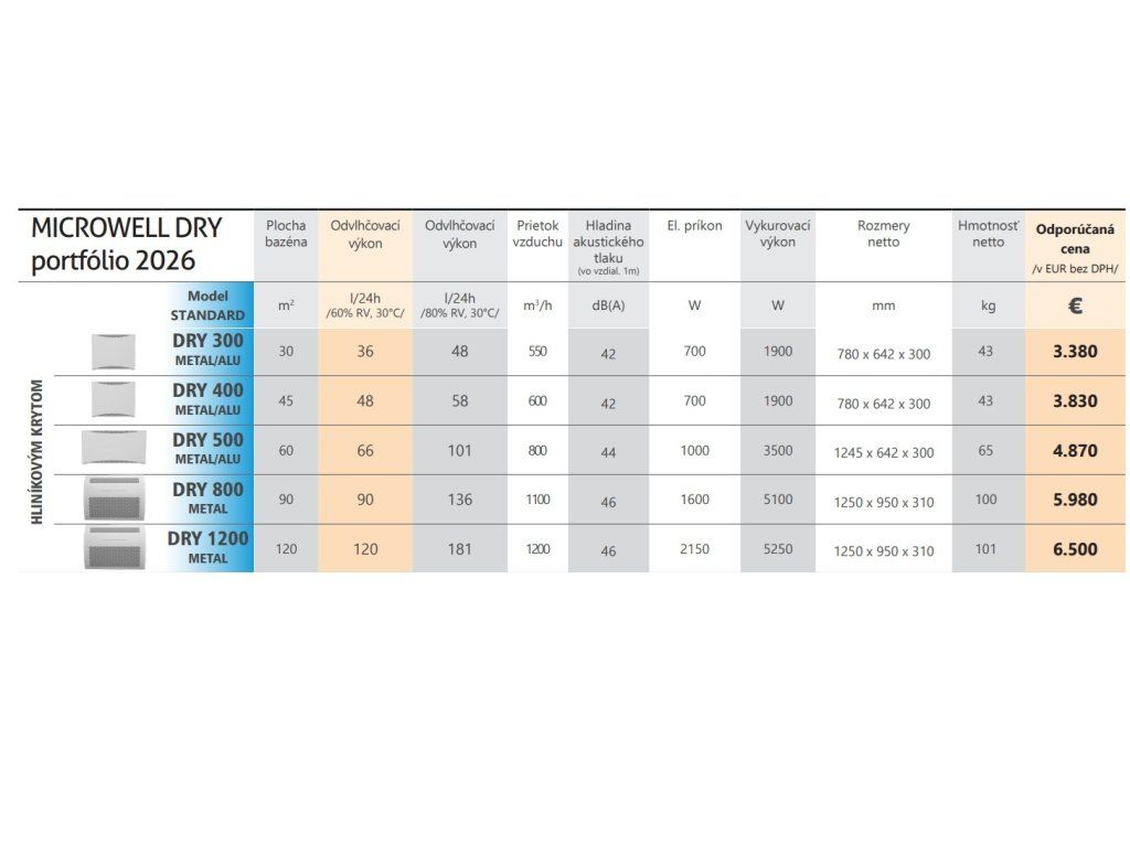 MICROWELL DRY 500 je komplexné riešenie na reguláciu prostredia vo vnútorných bazénoch. Vďaka monitorovaniu a regulácii vlhkosti a teploty vzduchu je MICROWELL DRY 500 vhodný pre stredne veľké bazény, wellness alebo vírivky. Funguje na princípe kondenzácie a zabezpečuje konštantné, spoľahlivé a vysoko účinné spätné získavanie tepla s najvyššou účinnosťou. Vďaka nízkym emisiám hluku a exkluzívnemu dizajnu je MICROWELL DRY 500 špičkovým inovatívnym riešením pre vnútorné bazény.