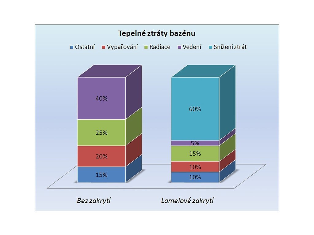 Na grafe vidíme tepelné straty nezakrytého a zakrytého bazéna – zakrytím bazéna ušetríme cca 60% energie potrebnej na ohrev bazénovej vody a pri použití solárnych lamiel navyše získame ďalších 10-15% energie zo slnečného žiarenia. Použitie solárnych lamiel pre vonkajšie bazény nahrádza zároveň komplikované pripojenie solárnych článkov na ohrev bazénovej vody.